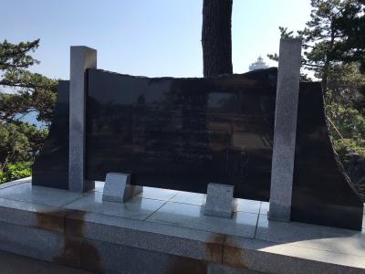 城ヶ崎海岸の、門脇崎の吊り橋を渡りきってすぐの場所に設置されている黒い石碑です。城ヶ崎海岸、海を見渡せる素敵な眺めの場所にあります。もともと伊東観光協会とのタイアップ企画で生まれた楽曲のようですが、残念ながら世代でなく、知らない曲でした。