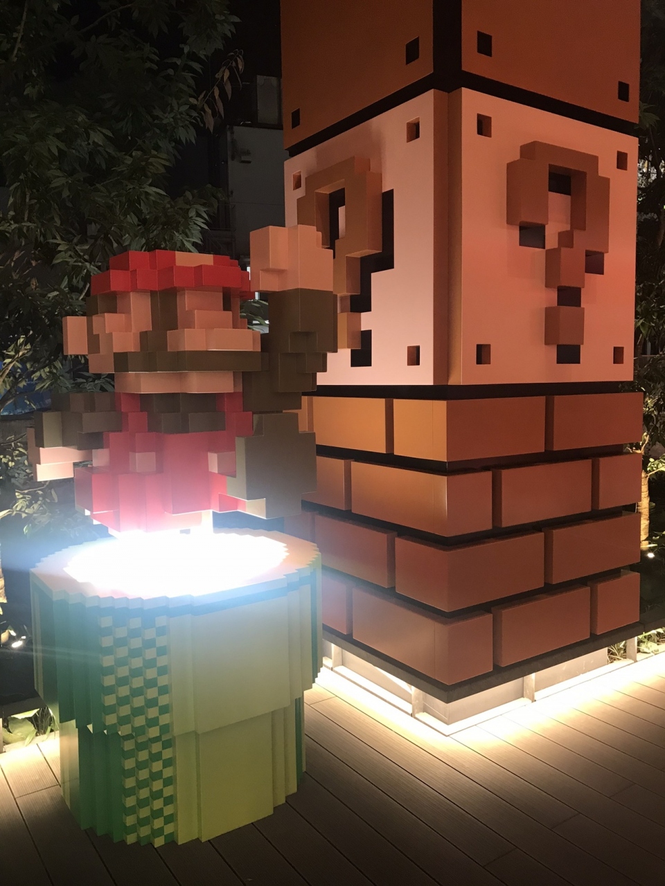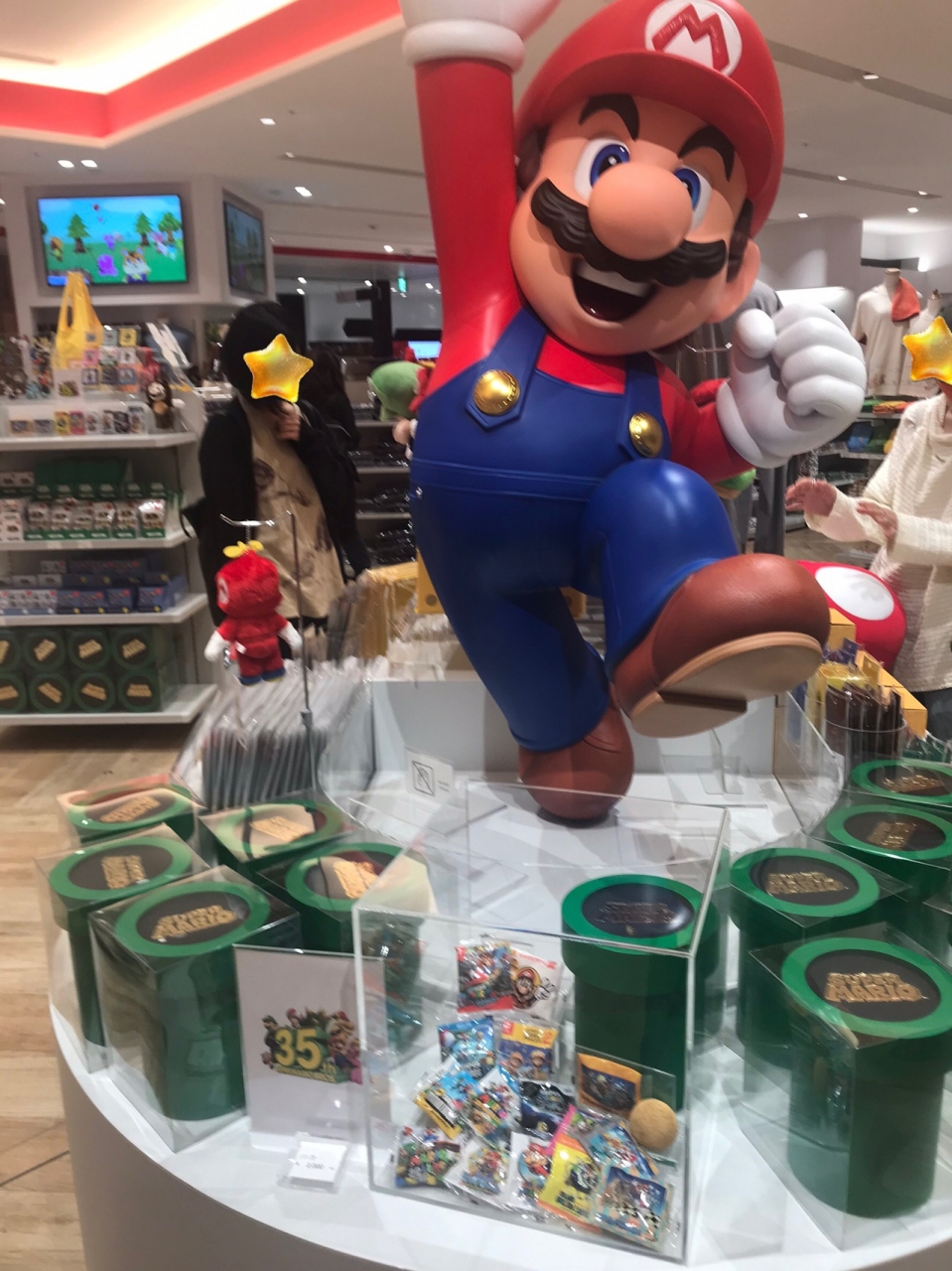ショップの入り口そばの6階のデッキには、マリオがハテナブロックにジャンプしているお馴染みの像がありテンションが上がります。