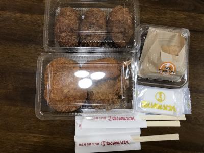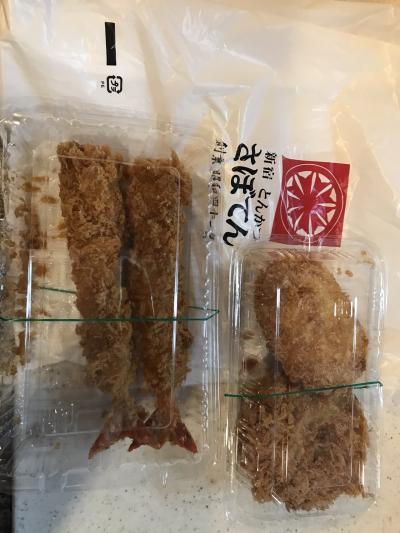 持ち帰りに、エビフライとメンチカツ、コロッケを購入しました。持ち帰りでもコロモはサクサクしており、とても美味しかったです。- 旅行時期