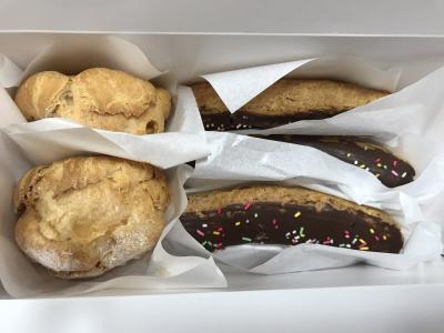 季節の限定シュークリームが楽しく、今回はチョコバナナシュークリーム祭りセットを購入してみました。チョコバナナの形のシューにチョコバナナ味のクリームが入っており、カラフルで可愛らしい見た目に子供も大喜びでした。定番のパイシューも安定の美味しさでした。- 旅行時期