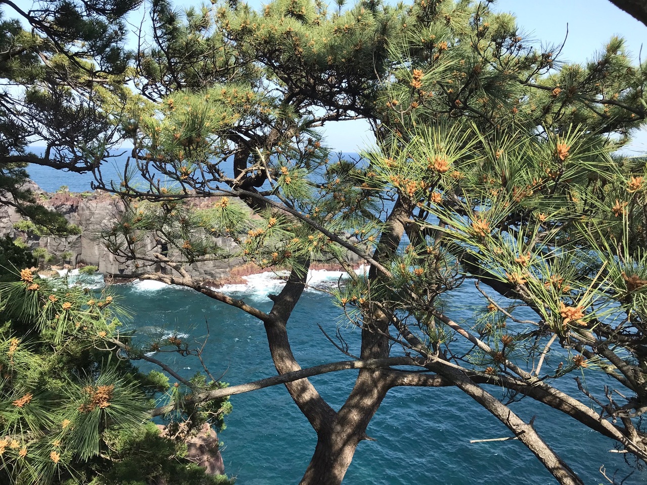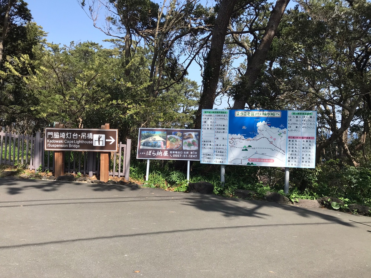 城ヶ崎ピクニカルコースの中でも、門脇の吊り橋と灯台があり、絶景のビュースポットです。駐車場から徒歩数分でこれらのスポットや、門脇崎の素晴らしい海岸線を眺めることが出来ます。大室山の噴火により溶岩が海に流れ込んで出来た岩の地形はダイナミックでとても素敵な景色です。