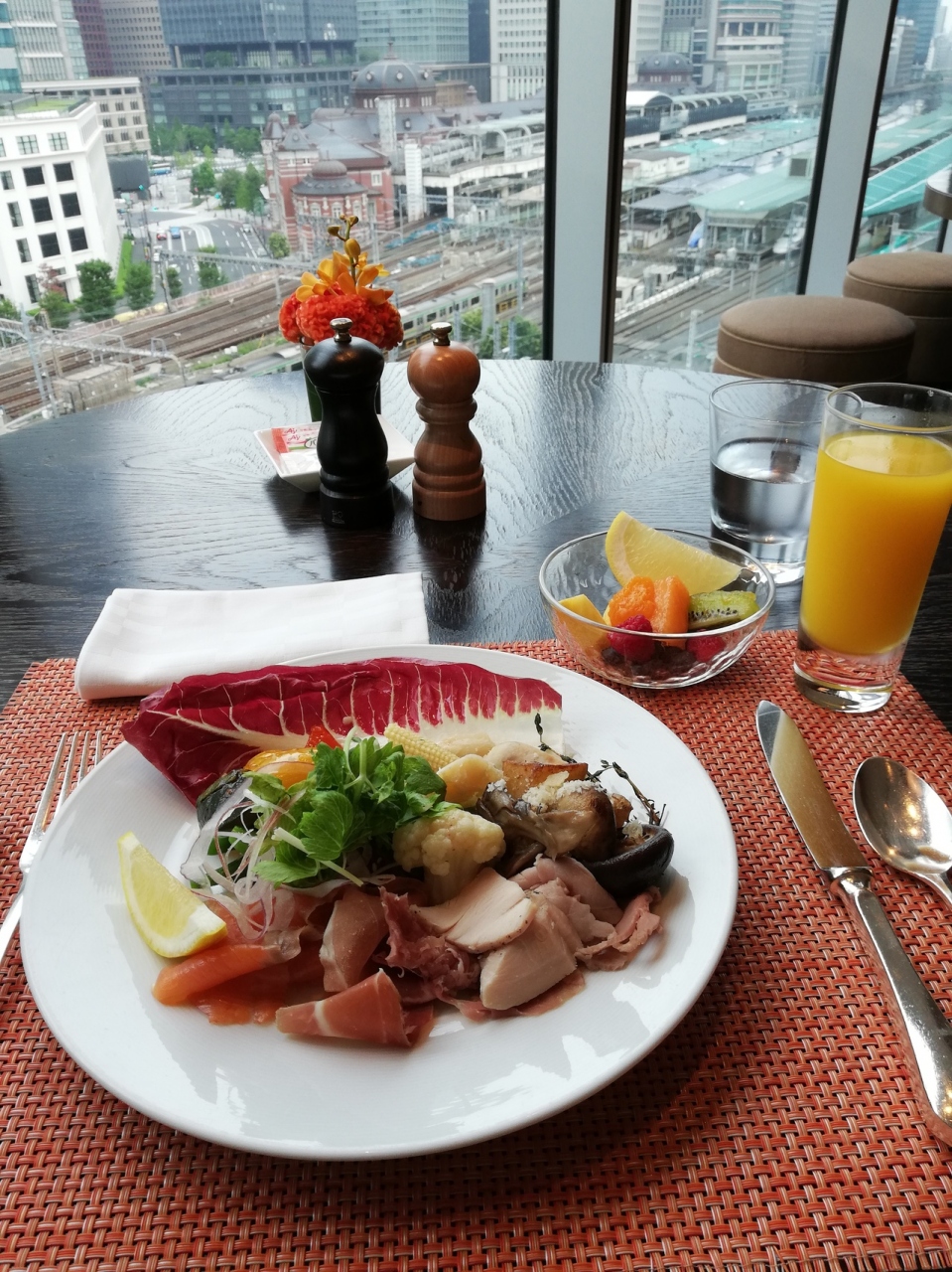 窓側の電車が行き交う風景や丸の内のビルが見える眺めの良い席でした。