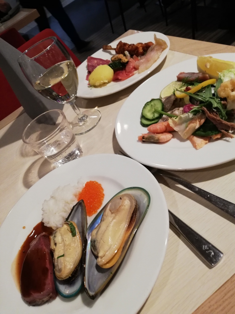 私はひとり旅だったので、海を見るより、にぎやかなプロムナードが見える部屋にしました。夕食は一泊目はビュッフェ40ユーロ、にしました。大きなムール貝が嬉しかったです。