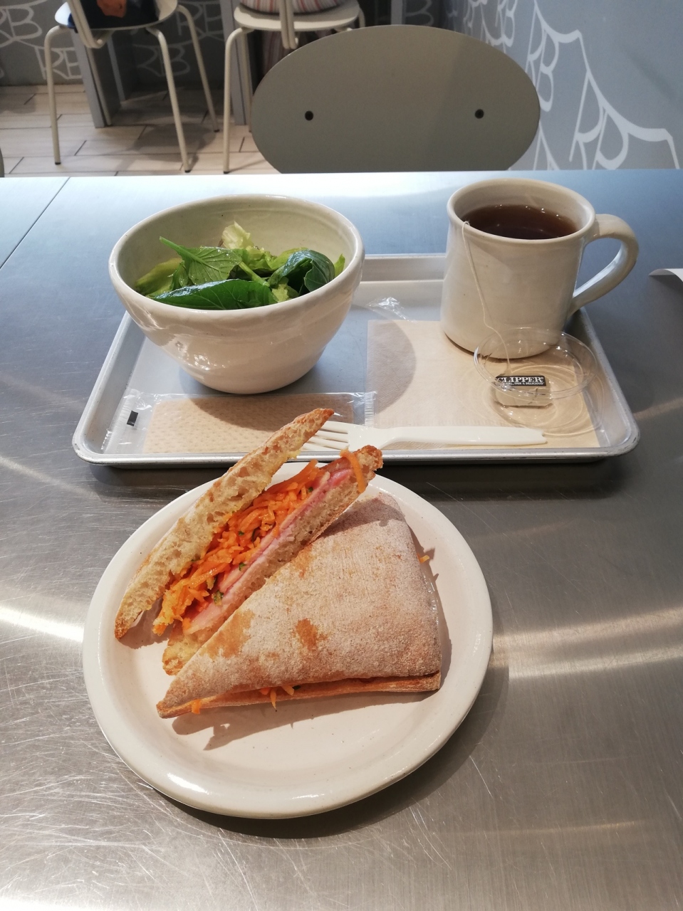 キャロットラペとハムの入ったサンドウィッチと、サラダとコーヒーか紅茶。