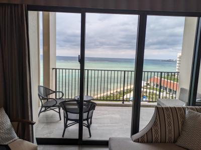 空港からのシャトルバスは40分とありましたが、20分くらいでつきました。道路渋滞がなかったからでしょうか。お部屋は全てオーシャンビュー。今回はプレミアルームを予約しました。ふるなびトラベルで支払いをしたのでお得に利用できました。とても良いホテルでしたが、一つだけ残念だったのは、社員旅行の団体客もいらしたので、朝食会場など賑やかだったことです。