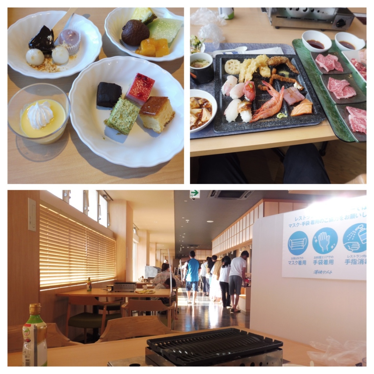 食事・・・熊野牛の焼肉、刺身、お寿司、天ぷら、etc. バラエティに富、スウィーツ、デザート、アイスクリームと、品数の多いのには驚き、子供にも対応した料理も多く、家族連れが多いのも頷けました。また来たいなと思わせる充実ぶりです。