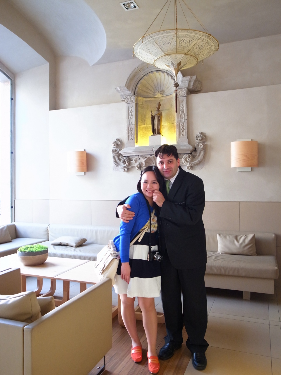 修道院を改装したホテルで明るく清潔なロビーにはマリア像があります