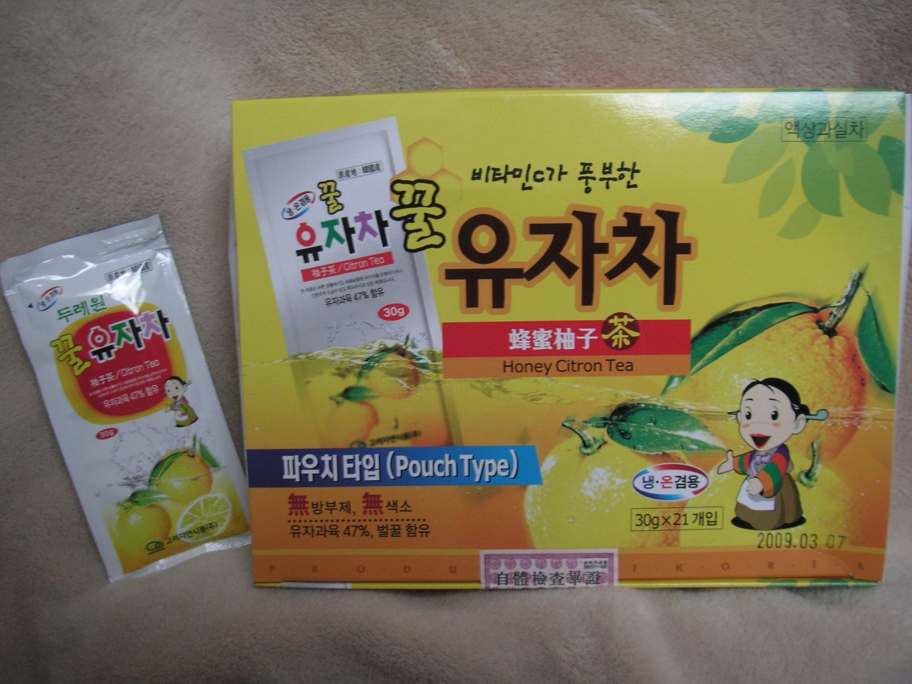 ビンに入ったゆず茶だと持って帰るのも重いし、割れそうだし、使用後もフタをふき取ってからじゃないと次使うときに開けにくくなったりしますが、最近はパウチタイプのゆず茶があります。これだと使うたびに開封することになるので新鮮だし衛生的ですよね。会社などへのお土産にも配りやすいのでおすすめです。ただし同じものなのに売っている場所で大きく金額が違います。ちなみに21パック入りはロッテマートでW6,000でしたが、南大門市場ではW9,000。金浦国際空港の免税店ではW15,000と倍以上の開きがあります。