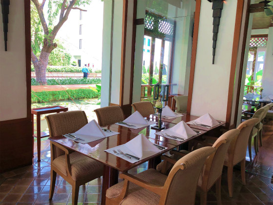 スコータイホテルの敷地内に足を踏み入れた瞬間から、ちょっと特別な空間に入り込んだ気がします。ホテルの建物と繋がってはいますが離れのような造りの「セラドン」はバンコク市内でも有名な高級タイ料理の店です。