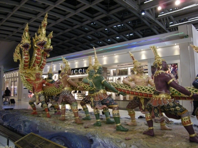 バンコクから出国する側では、まず「乳海撹拌」という大きな神様の彫刻が目につきます。この彫刻が圧巻。色と言いサイズと言い、日本ではあまりお目にかからないタイプの作品で思わず目を奪われます。ここで写真を撮っている旅行者は多数。