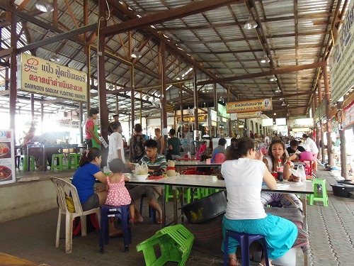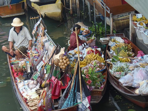 9時半を過ぎたころから観光客の姿が激増してきます。観光の仕方は、川岸の通路を歩きながら水に浮かぶ船の店を見おろすも良し、でもやっぱりお薦めはボートに乗って、実際に川に出ることです。乗船料はプライベート(船頭つき)で1200バーツ払いました。(交渉可能)他のお客と一緒でもよければ、ぐっと安くなるはず。これで一時間のボートツアーを楽しめます。
