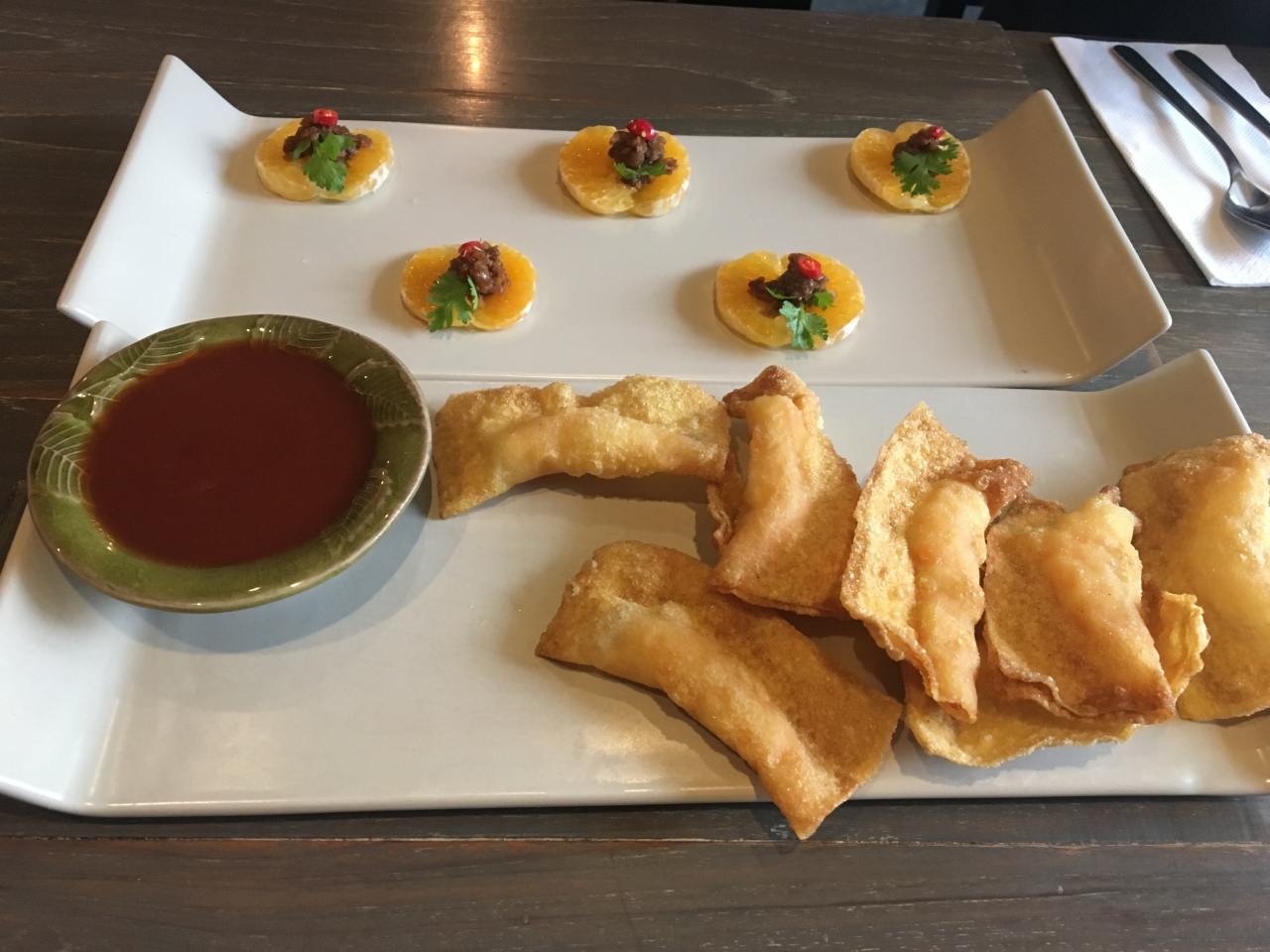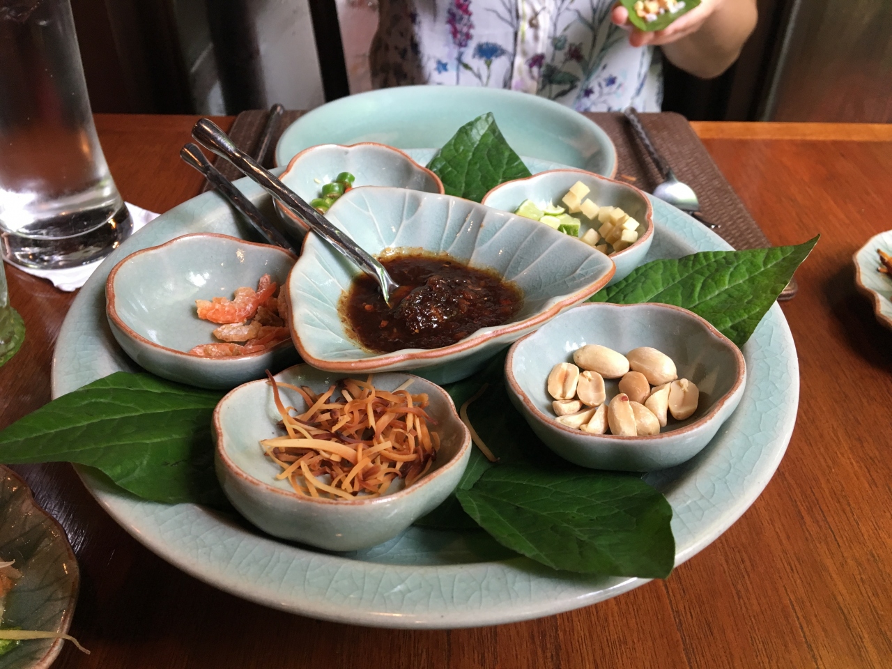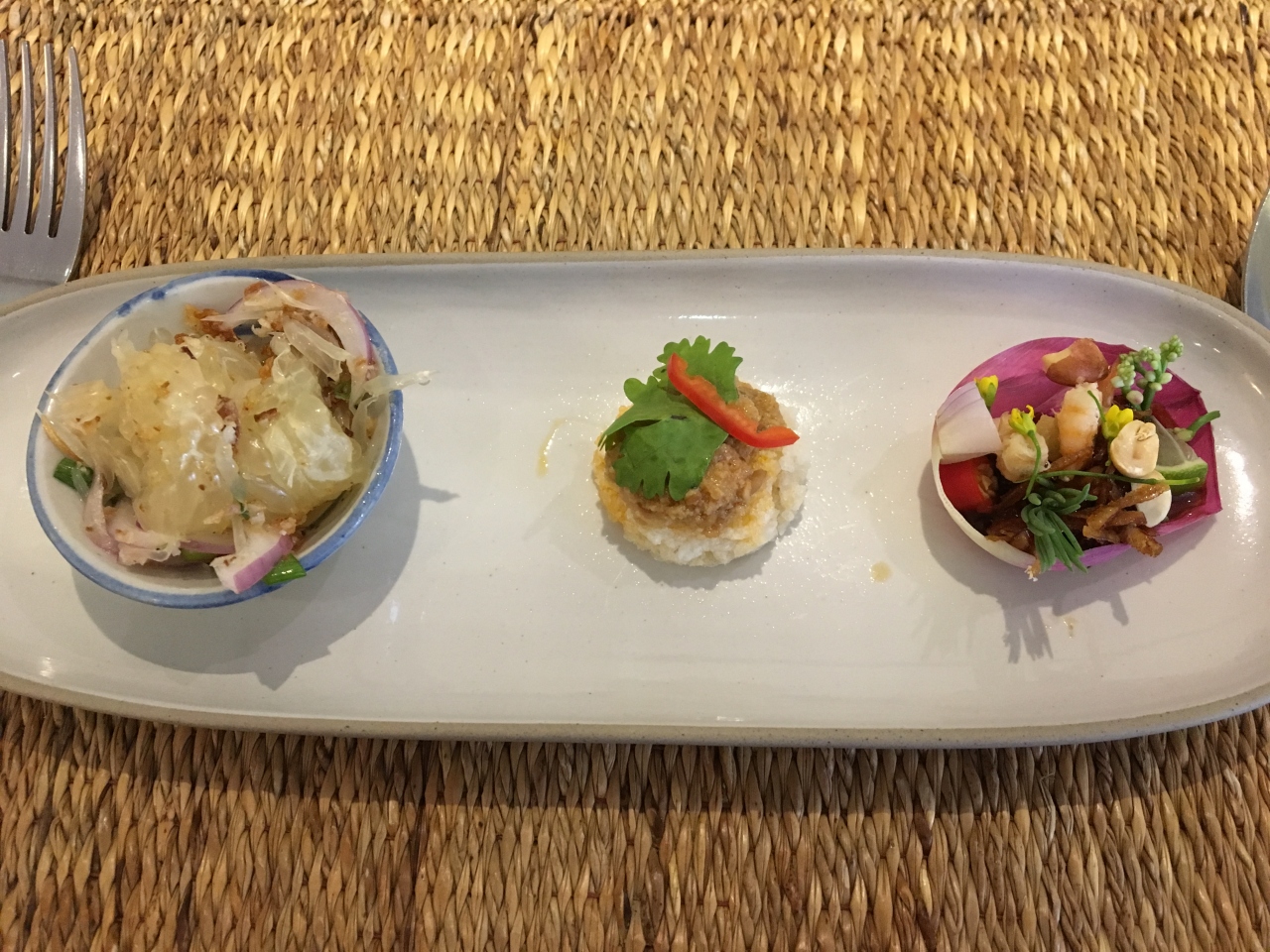 まずは最初にスターターの3点セット。ライスクラッカーにポメロのサラダ、花びらごと食べるナッツ類にはチリがのっているので気を付けて笑