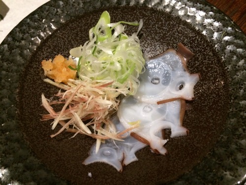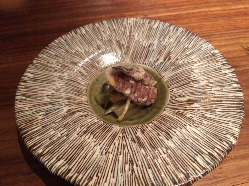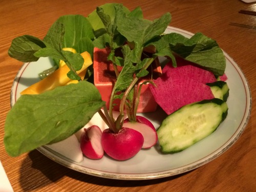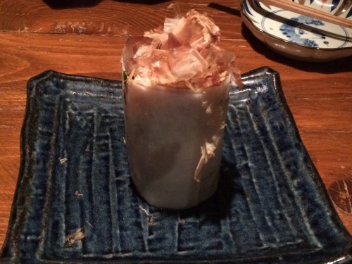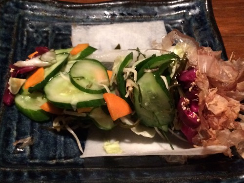 今回はじめて頼んだ漬物の盛り合わせは、薄く剥いた大根に漬物が包まれているという凝り様。見た瞬間「は?」という感じだが、開いた瞬間に驚きと感嘆。