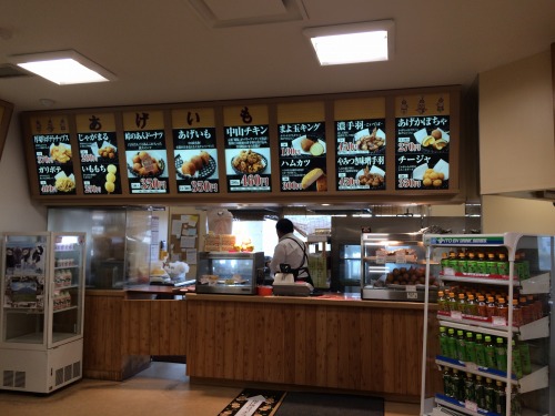 あげいも目当てだったのですが、道の駅には他にも色んなものがあって、ここで少しの時間を過ごせます。フードコーナーもそこそこ充実、外のテーブルに座りながら食事できるのですが、そこからの眺めがとっても綺麗。周りには自然しかなくて、遮断物もなく、とにかく広い視界でずっと向こうまで臨むことができる景色が一望です。チョッと寒かったけど。