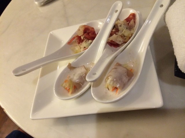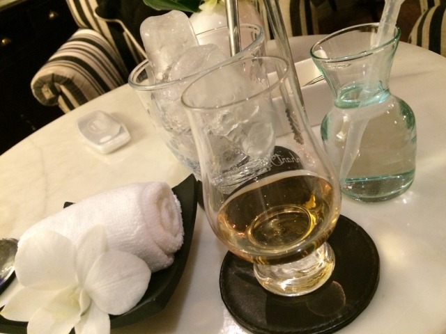 一杯目がミントかバジルを散らした軽めのカクテル、2杯目がブランデーアレキサンダーだったかな(あまりの美味しさに30秒で飲み干しました)、そして3杯目に「白州」。日本のウィスキーだっていいのがちゃんとあるんですよ。