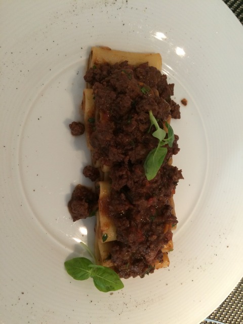 帯状の太麺がキレイにまかれて並べられた上にボロネーズソースがかかっている。
