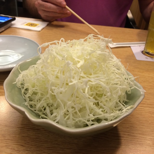 衣はサクサクしてるし、肉の味も良い。サービスキャベツはシャキシャキっとした細切りだし、タレの味も薄味ながらしっかり美味しい。