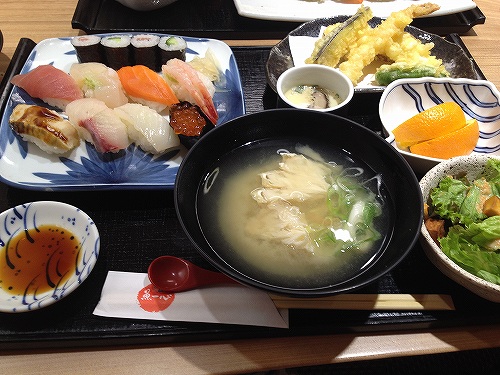 メニューからして思わずそそられる贅沢なセットが勢ぞろい。自分が頼んだのは握りと天ぷら、茶碗蒸し、蟹の味噌汁にフルーツという量も種類もビックリするようなボリュームのセット。なのに確か値段は1500円程度だったと思う。