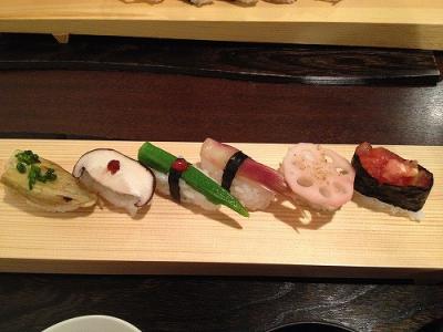 なによりもおススメしたいのは、ここの「野菜の握り」。ナスやみょうが、レンコンなど、6種類の野菜の握りがコースの最後(デザートの前)に出される。これが絶品。