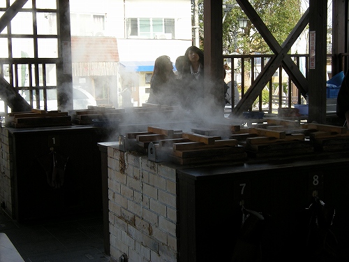 足湯は知っていたが足蒸しは初めてなので試してみたが、ものすごーく熱くって、自分にはとても脚を入れておくことができなかった。蒸し場ごとに温度が違ったのかも。