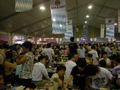 中でも圧倒的人気を誇るのは「パウラナービール」の巨大ブース。ここは完全なビアガーデンとして、会場一杯にテーブルが並べられ、ステージ上では次々とショーが繰り広げられます。