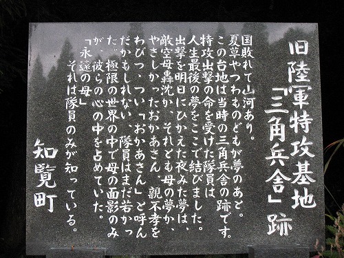 敵から見えにくいように三角の屋根だけがあるように見せて造ったことから「三角兵舎」と呼ばれる宿舎の跡。知覧から飛び立つ特攻隊員が最期の数日を過ごした場所である。