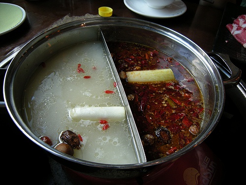 選んだのは白湯スープと真っ赤なチリスープ、中にはクコの実や漢方に使われ