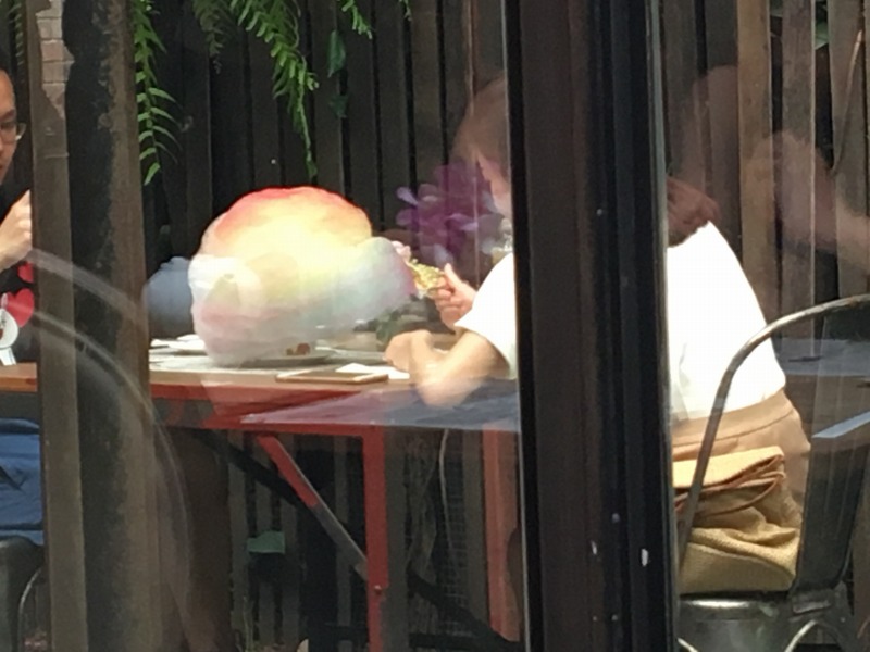 タイ人カップルはお決まりメニューの「虹色綿菓子」を前にセルフィー撮ったり、キャッキャ楽しそう。大きな綿菓子の中には小さなグラスに入ったケーキが登場します。