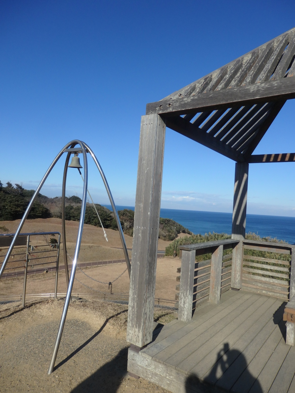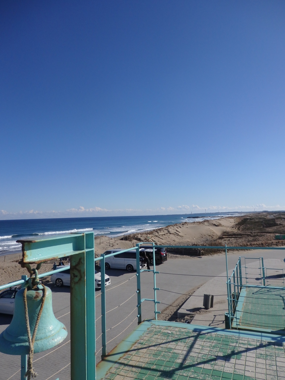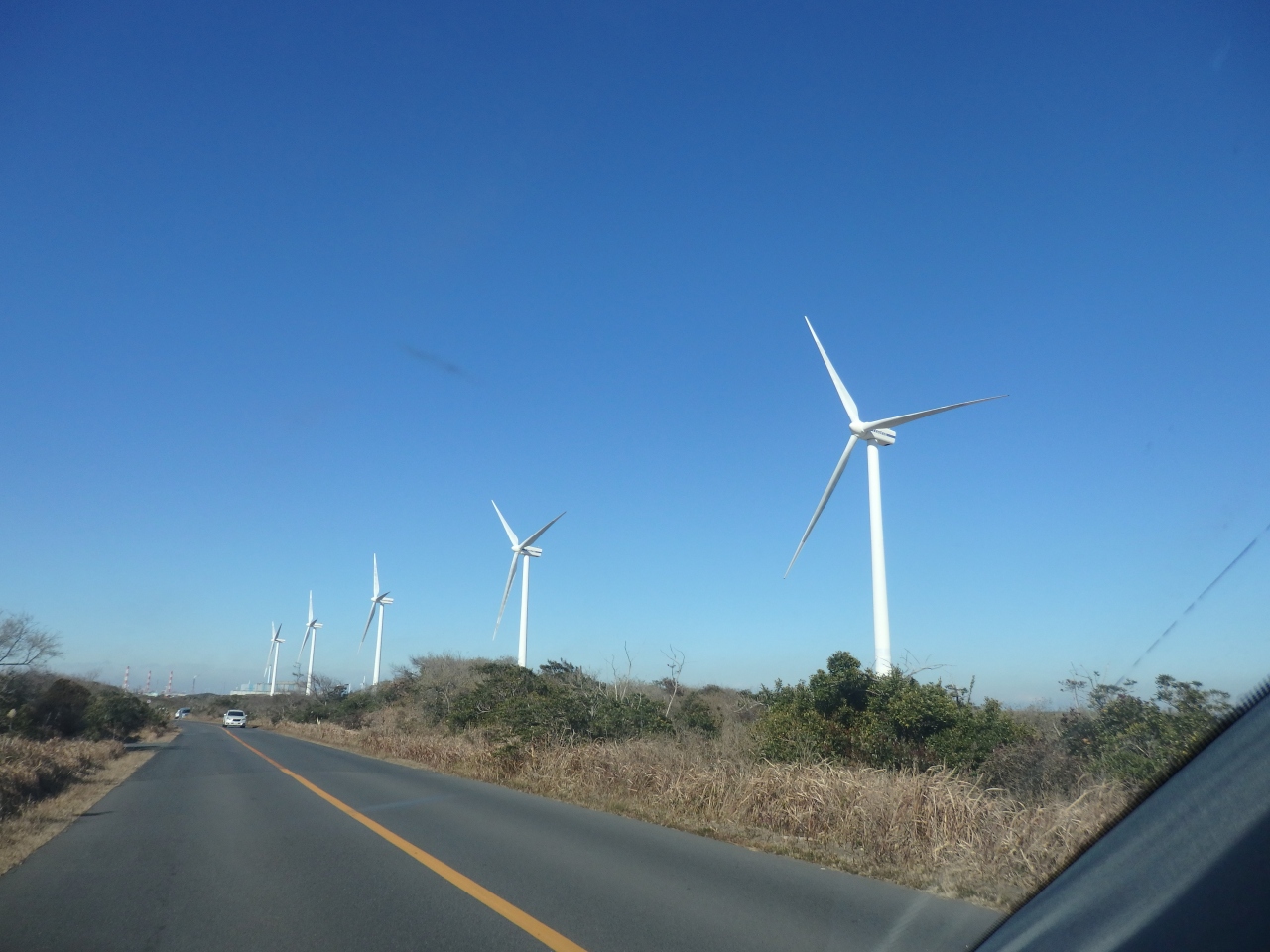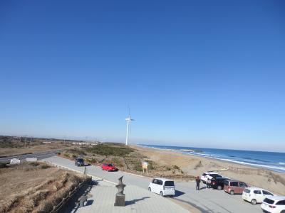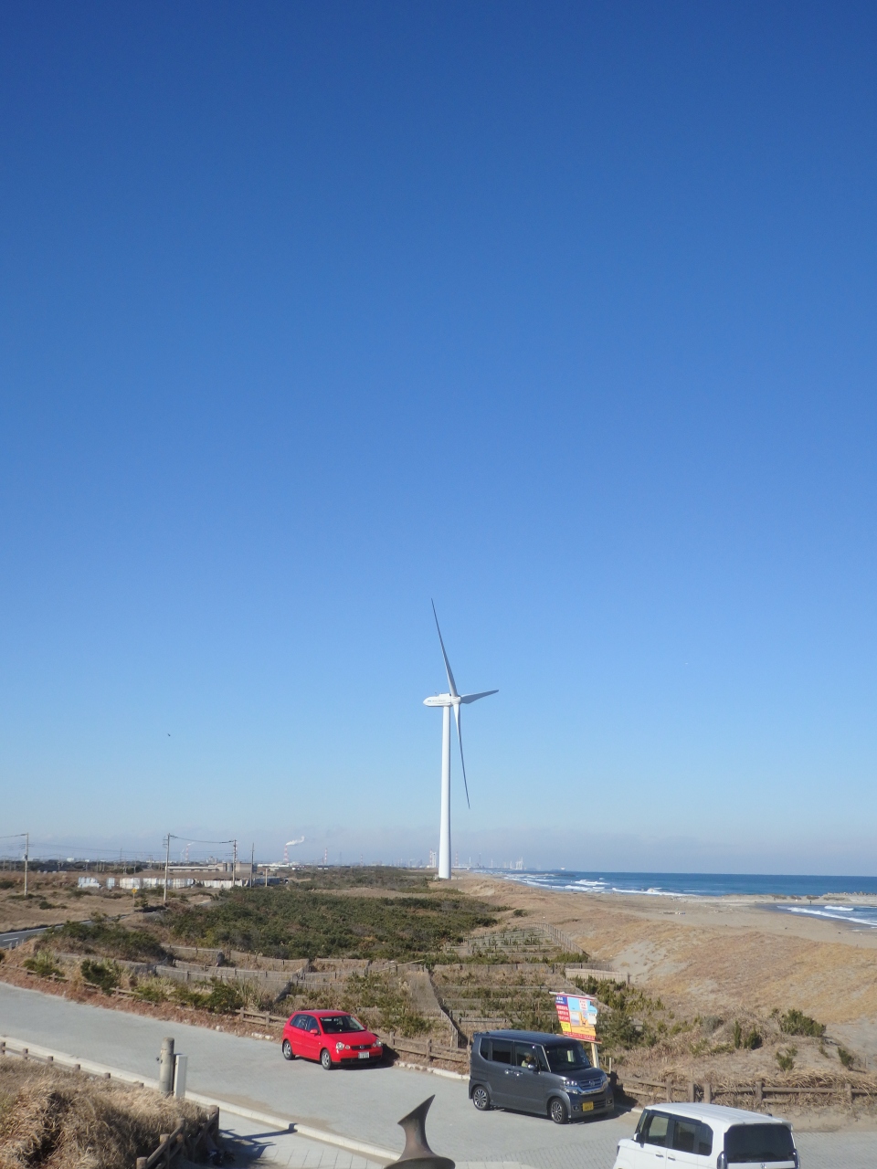 長く遠く続く海岸線を見下ろす丘に展望台があります。展望台から風力発電のための大きな風車が、点々と海岸線沿いに立っているのが見えます。駐車場は海釣りやサーフィンを楽しむ人でしょうか、埋まっていますが、そもそも空いてるので、ちょっと道路沿いに停めても少しなら平気でしょうか。(冬だからかもしれませんが)