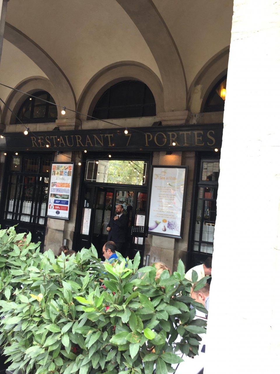 1階のバルにするか、2階のレストランにするか? って聞いてくれてるんだけど「食べられるものが違うのか?」って質問が通じなくて、まずはメニューを見せてもらってオックステールのシチューを決めてから1階の中庭の適当なテーブルに座りました。