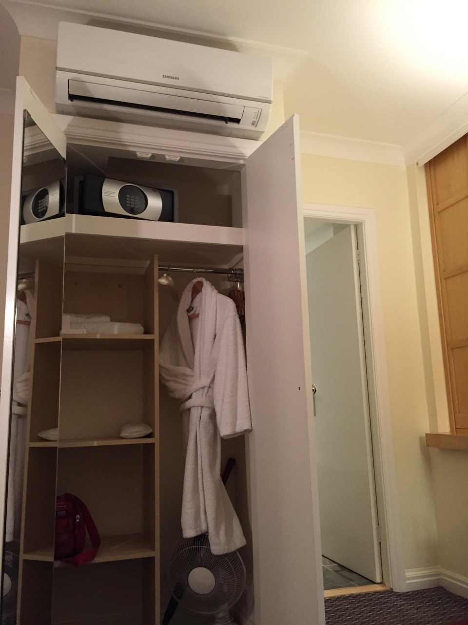 スーツケースを広げるとやはり床は狭くなってしまう感が否めない、といった広さではありますが、古いホテルなりに、リノベーション時に色々工夫したところがみて取れる間取りや窓周りには、なんか感心しちゃいました。心憎いというか、狭くてもそれぞれは広く感じられるアイディアがあるというか。