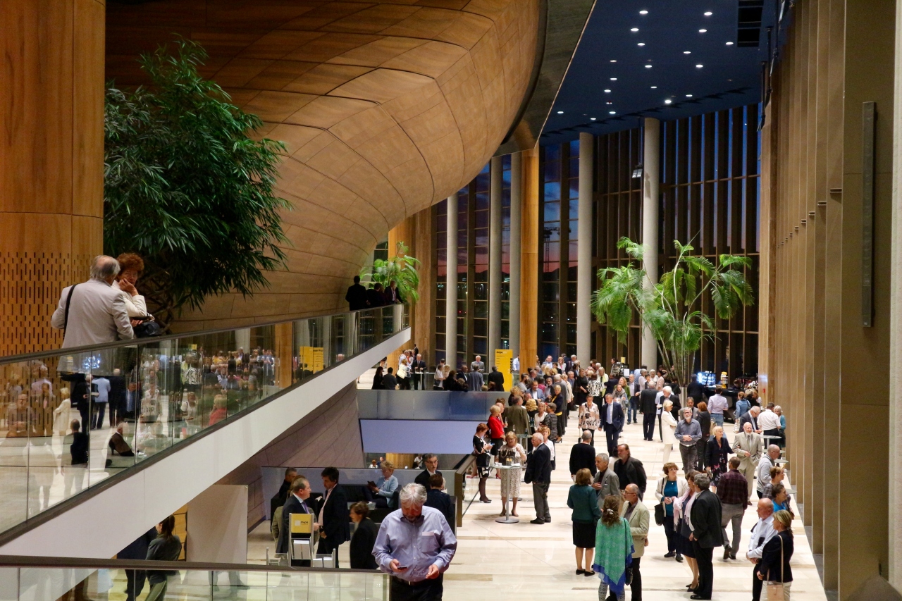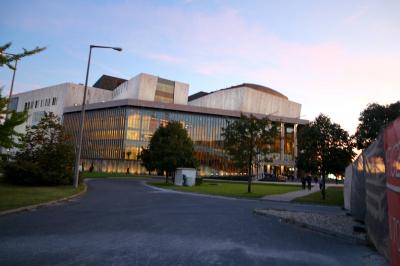 建物の外側はコンクリートの灰色のドデーンとしたものでしたが、中に入るとそのギャップがありまsた。ロビーは広々としていて豊かな空間でした。木材を有機的な意匠として使っているのが印象的でした。