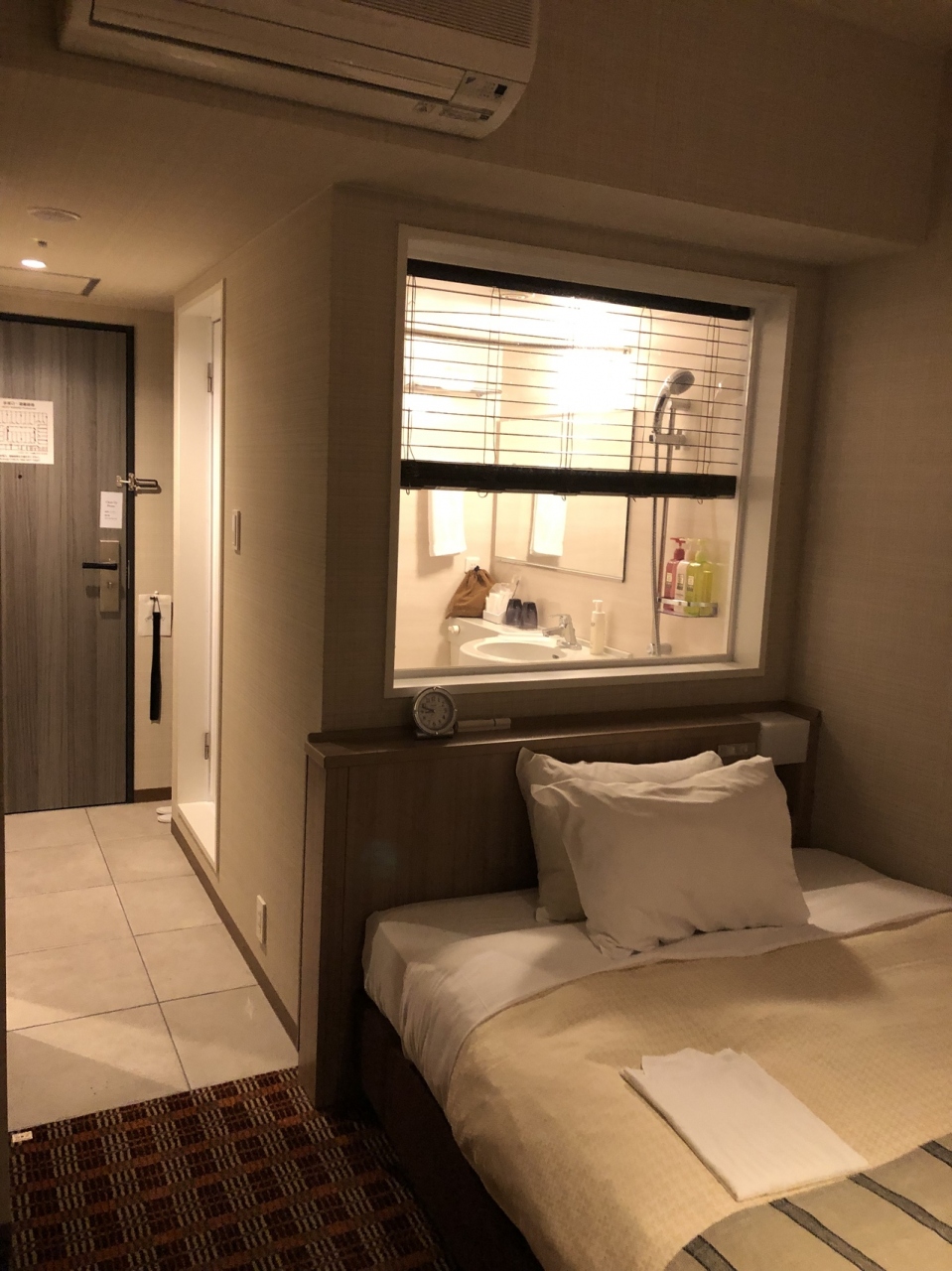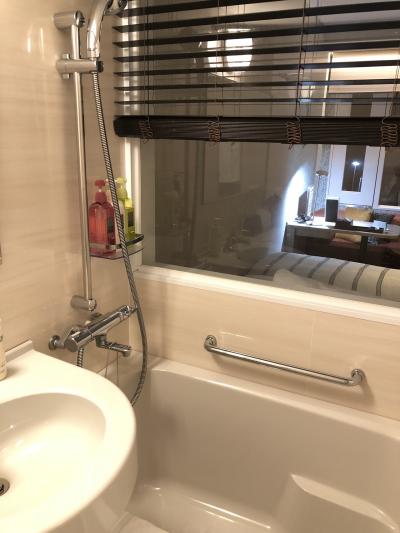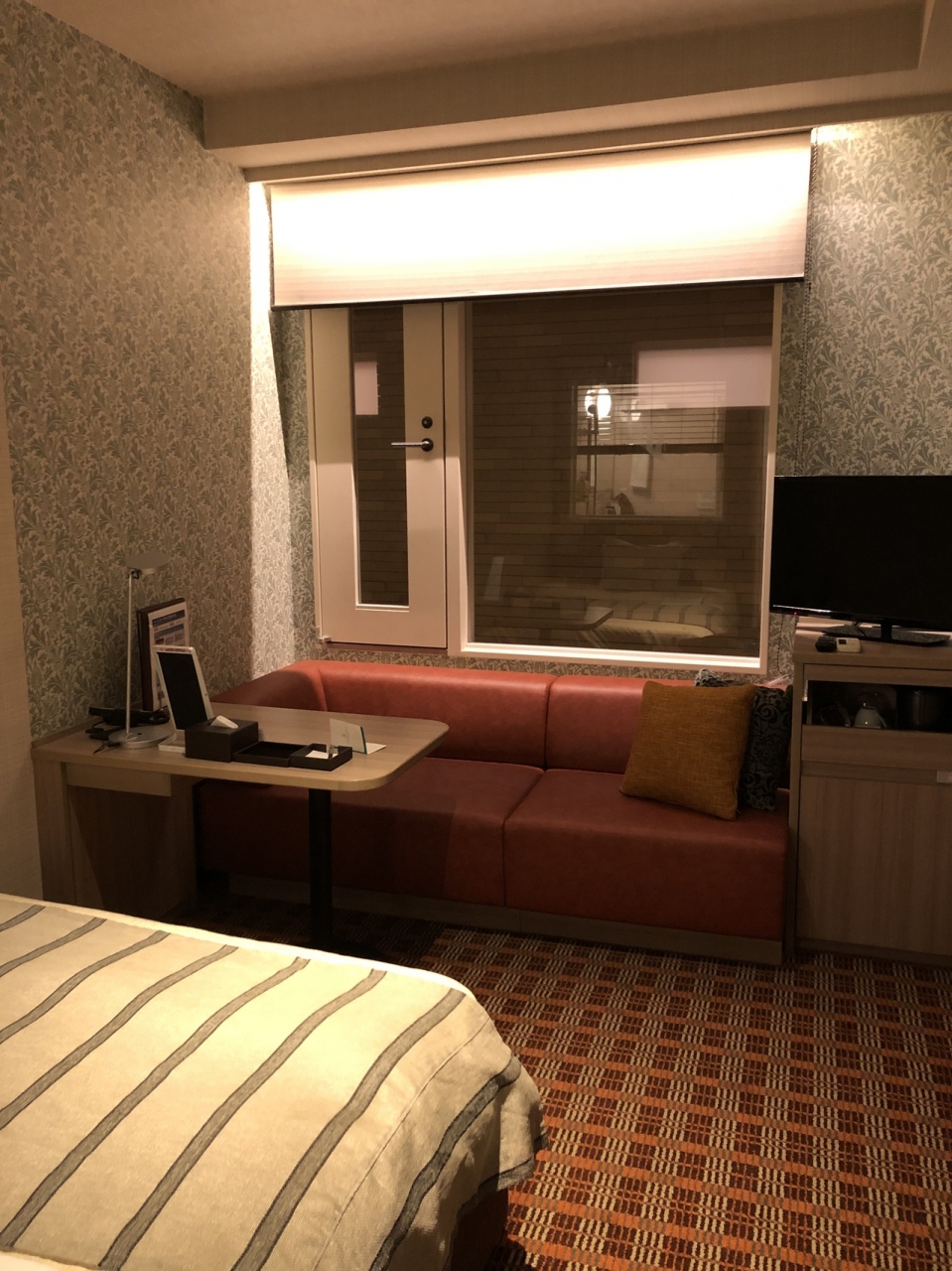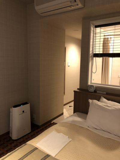 セミダブルのベッド、ゆったりのコーナソファ、ブラインド付きの腰上ガラス張りのバスルーム、空気清浄機もありなかなか快適でした。