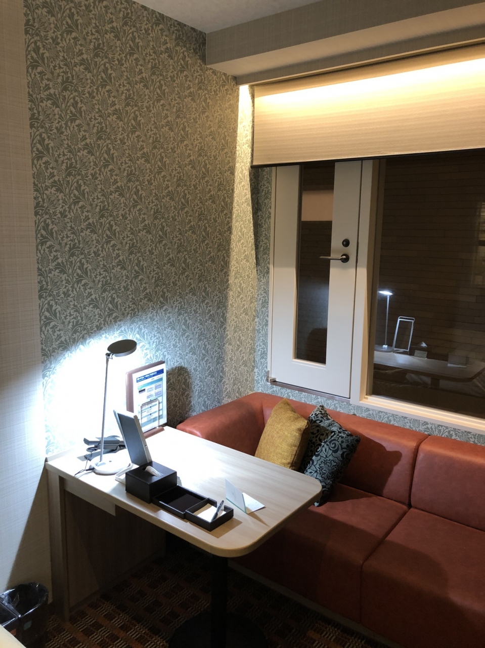 アトリウムルーム、中庭に面した部屋に宿泊。中庭といっても緑があるわけではなく、外壁側の部屋ではないために窓がないため、建物内部に設けた吹き抜け側にガラス窓を設けて解放感を出しているお部屋でした。