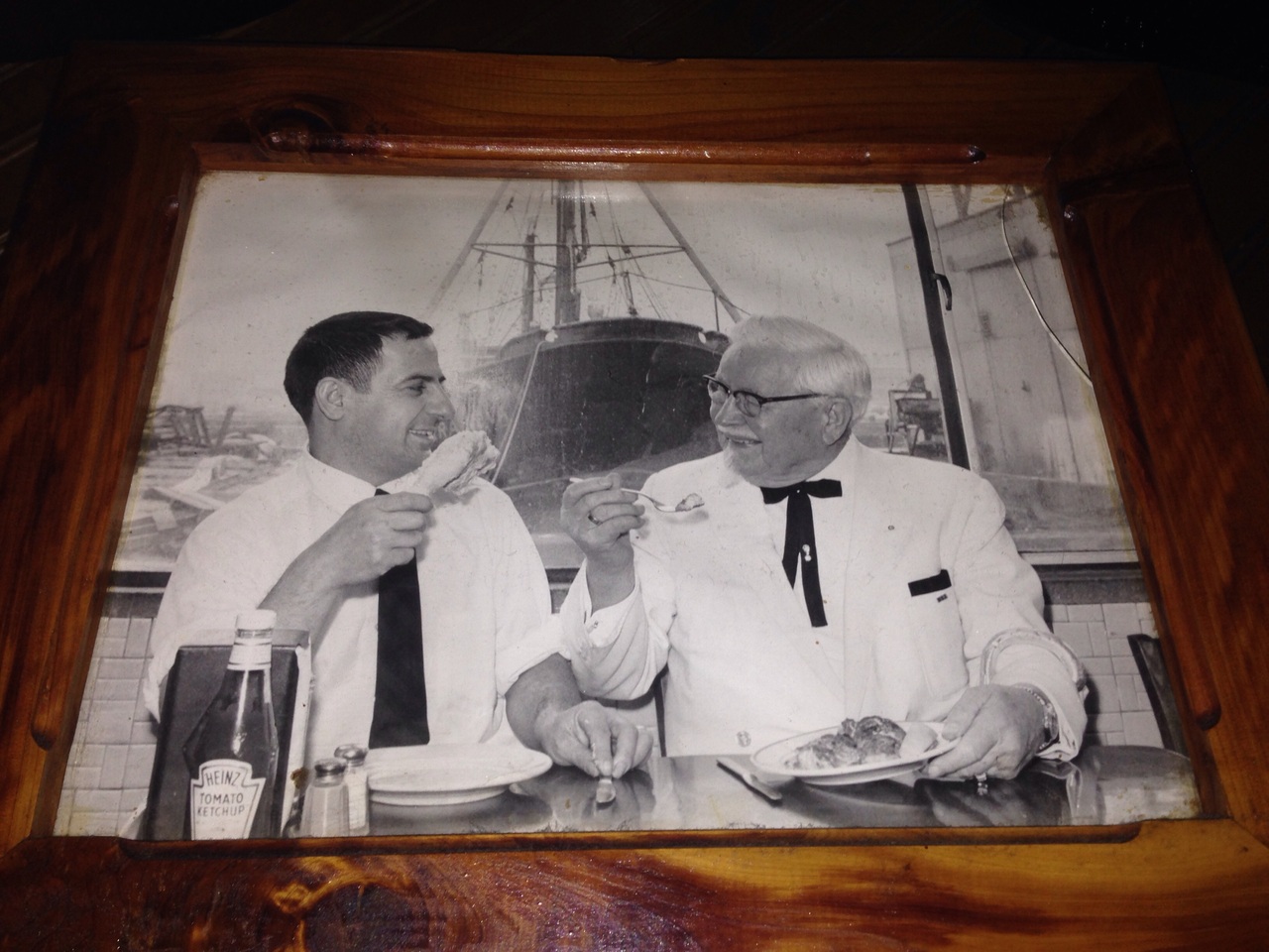 日本人なら誰もが知るケンタッキーフライドチキン(KFC)の創業者、カーネル・サンダース氏が来店した時の写真が飾られてありました。
