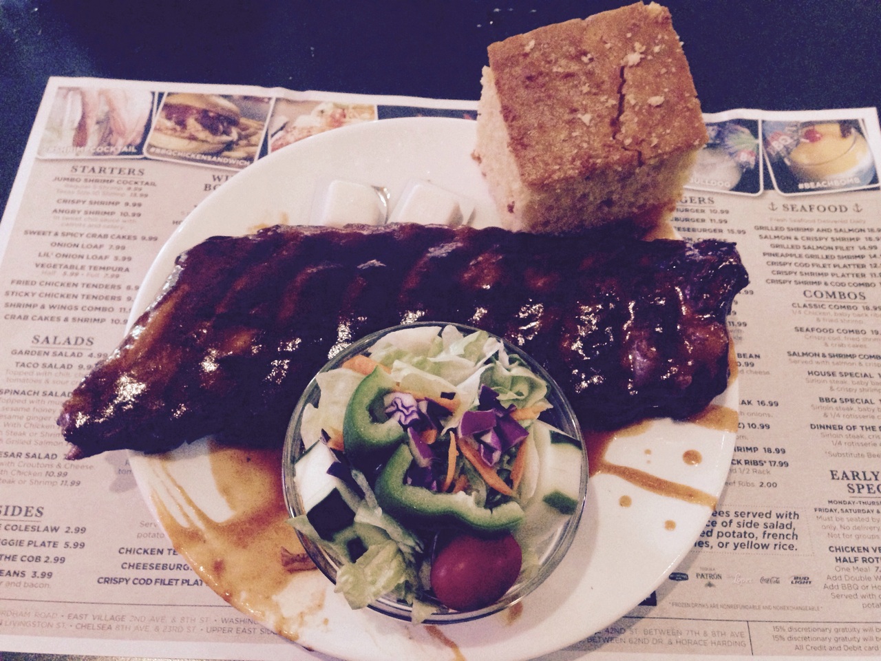 私はBBQ BABY BACK RIBSを頼みました。5時までオーダーができるランチサイズ($9.99)にしました。レギュラーサイズだと量が多すぎるのでランチサイズでちょうどよかったです。