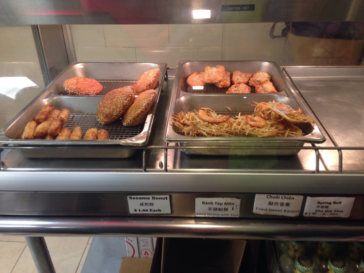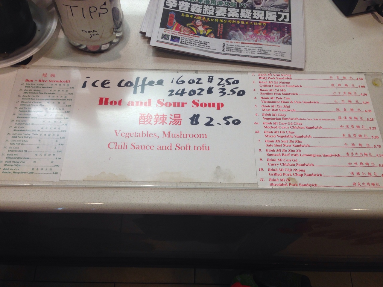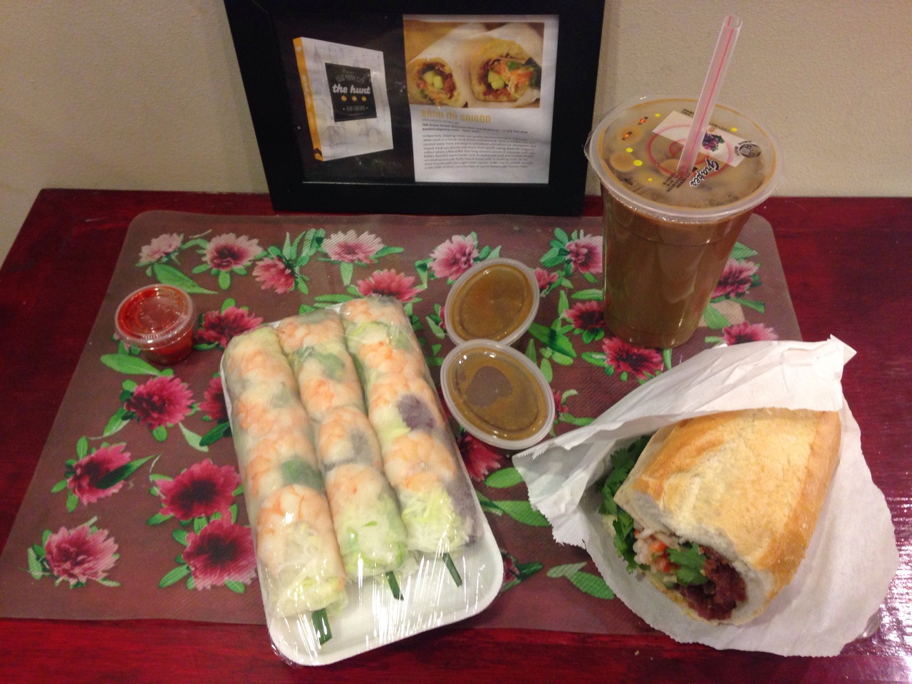 私は1番人気のBBQ Pork SandwichとSummer Rolls($5.25)とIce Coffee($2.50)を頼みました。