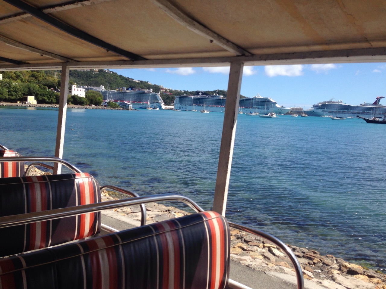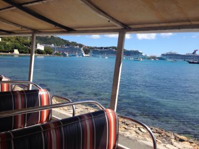 タクシーと言うと自家用車を思いうかべますが、セント・トーマス島のタクシーはバンか、ドアが無いサファリバスでした。