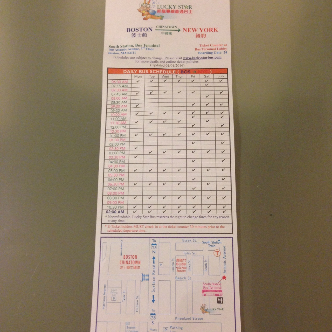 LUCKY STAR はNY行きの始発バスが早朝6時半、最終バスが深夜2時と早朝から夜中まで日中は時間に1本位出ているので非常に便利です。