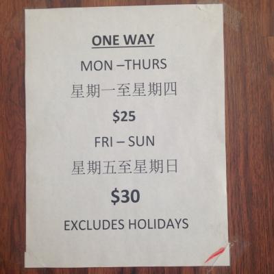 運賃は片道、月曜日~木曜日は$25、金曜日~日曜日は$30と激安です。