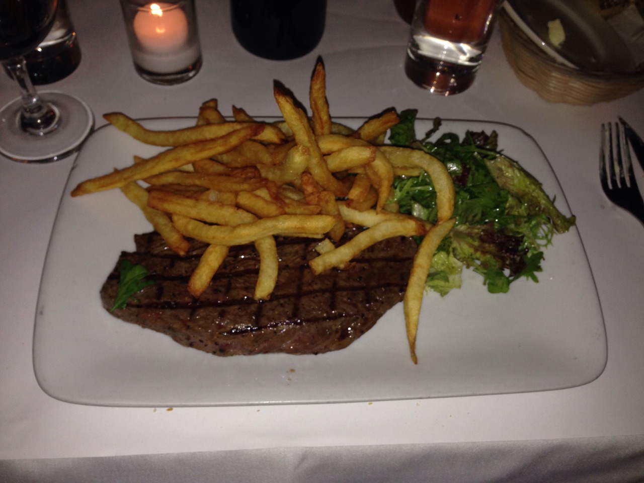 NYに行ったら、どうしてもステーキが食べたかったのですが、お洒落なレストランはお肉だけで、$50位してしまいます。でもこのお店のステーキ、フライ、サラダのセットは$22で美味しいステーキが食べれます。雰囲気もよく、遅くまでやっているので、観光に行かれる方にもオススメです。