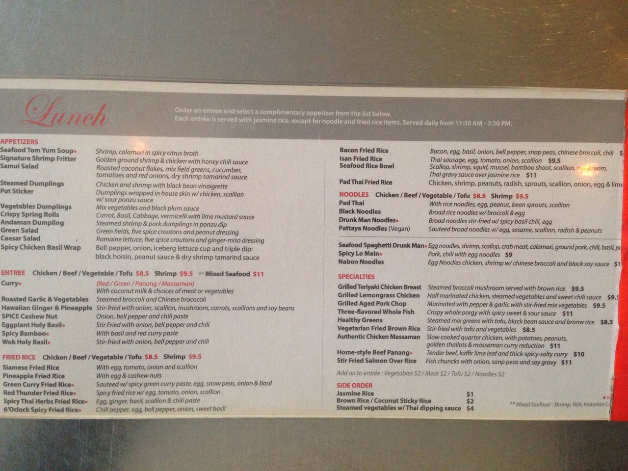 ランチタイムのカレーは野菜、ビーフ、チキン、豆腐は$8.5で、エビ$9.5、シーフードミックス$11です。