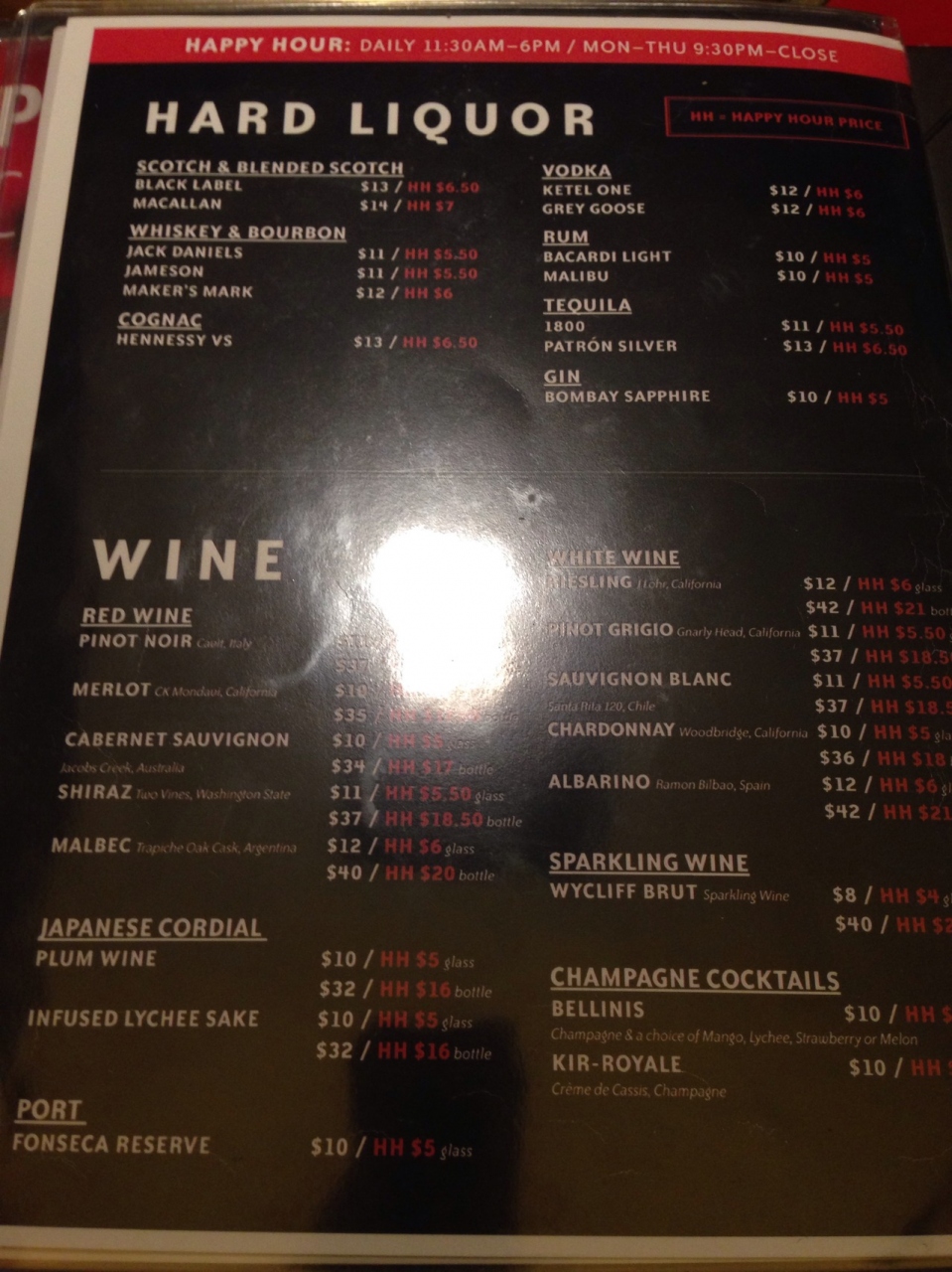 9時20分頃に席に案内されて、3日間の間、夢にまでみたハッピーアワーメニューを次々に頼みました。私達はお酒をよく飲むので、一番高い赤ワインのボトルを半額の値段で飲めたので、赤ワイン2本とシャンパン1本飲んでしまいました(笑)