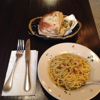 $9.95のPRIX-FIXE LUNCHはパスタとメインディシュの二種類が選べるのですが、今回はPENNE-GARIC OILのパスタを頼んで、麺をペンネから普通のスパゲティーに変えてもらいました。(無料)
