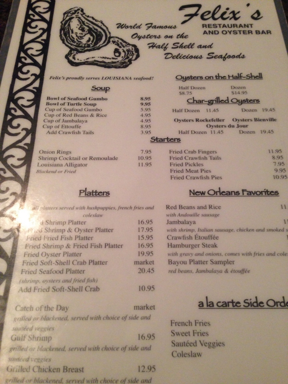 座ったのが、牡蠣を剥いてるお兄さんの前だったので、食べ終わったらすぐに空港に向かわなければならないと伝えたら、すぐに剥いてくれました。1ダースしか頼んでいないのに、何個かの牡蠣をお兄さんにサービスしていただて、ニューオリンズ最後の晩餐が凄く良い思い出になりました。- 旅行時期