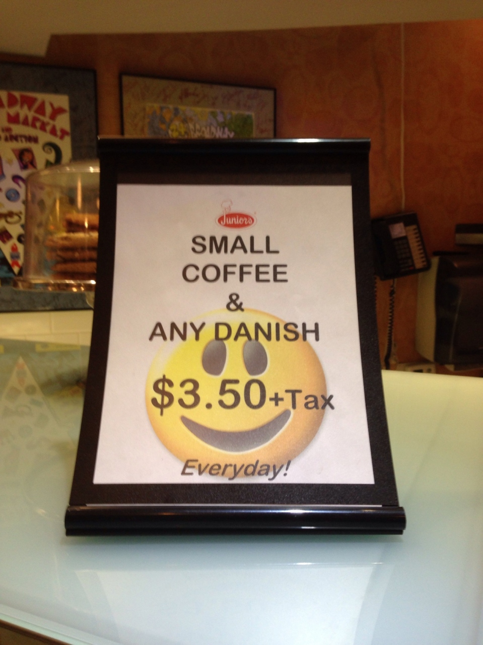 私はコーヒーとデニッシュで3.50ドルと言う、タイムズスクエア付近では非常にお得な料金のセットを注文しました。