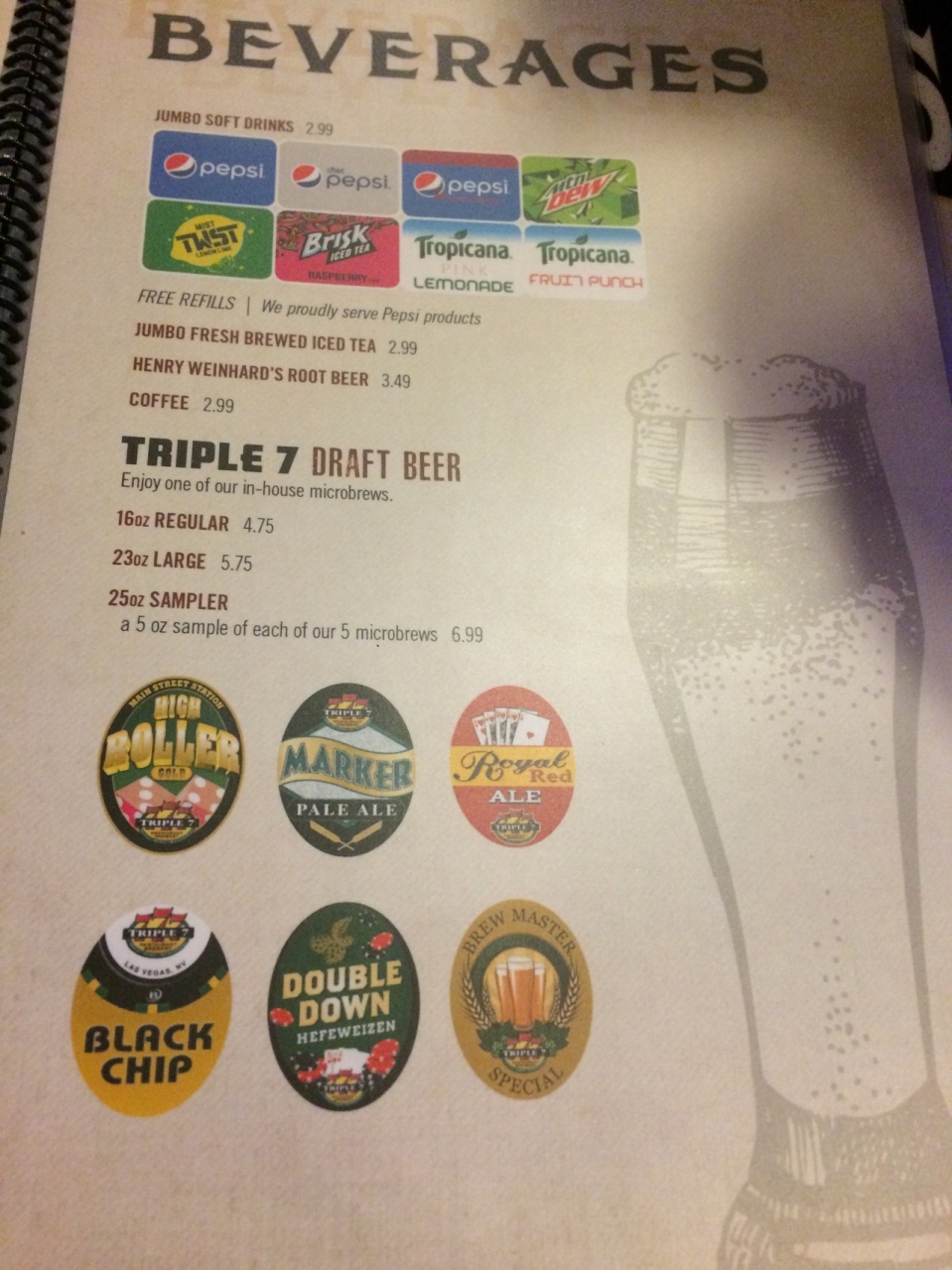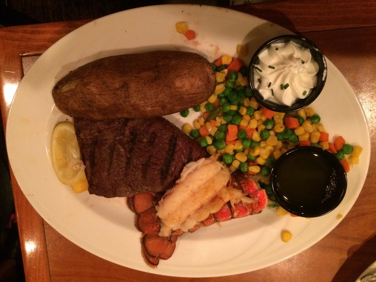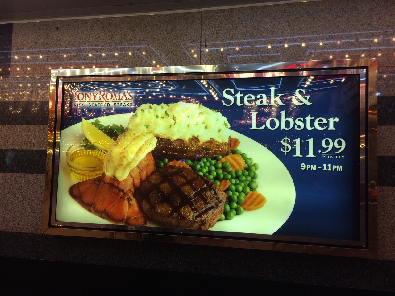 宿泊していたストリップからダウンタウンに来た時、偶々目に入った看板を見て決めました。9PM~11PMのハッピーアワーはステーキとロブスターのコンボが$11.99でした。
