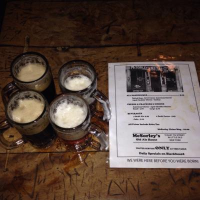 NYで1番古い、歴史があるバーです。店内に入ると店員さんに、「ダークかブラウンどっちだ?」と聞かれ、迷っていると、「じゃハーフな!!」とハーフにされます。このお店は一回オーダーすると、2杯来るので、ダークかブラウンかを聞かれた時に半分で頼むと両方楽しめます。