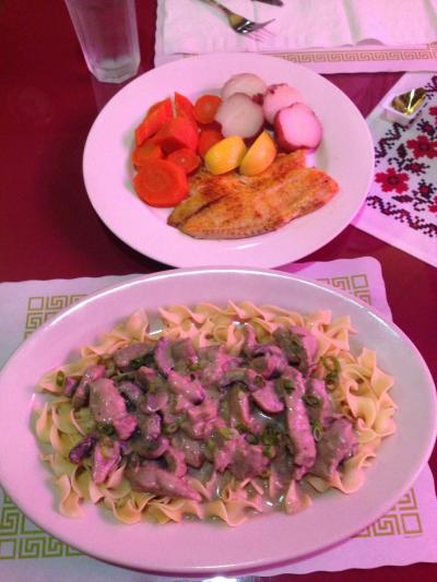 魚も味見させてもらいましたが、魚も茹でた野菜も味が薄すぎて、私のビーフストロガノフのソースに付けて食べると調度良かったです。