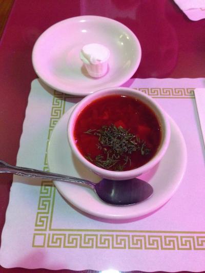ロシア人の友人と行ったのですが、私と友人はウクライナボルシチのカップを一つずつと、私はビーフストロガノフを頼んで、友達は魚を頼みました。
